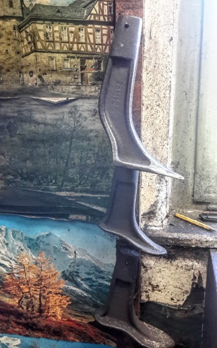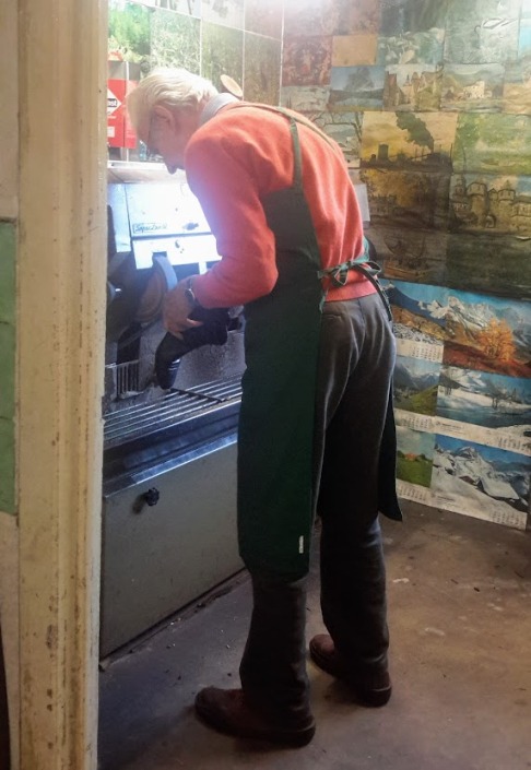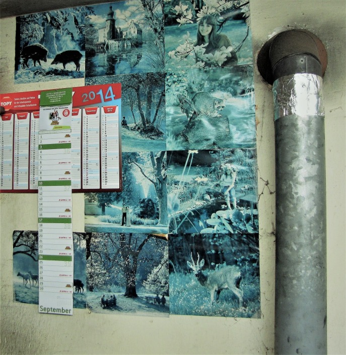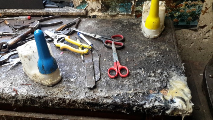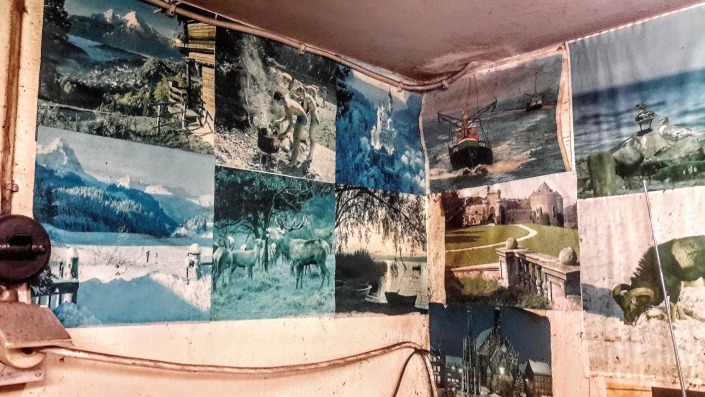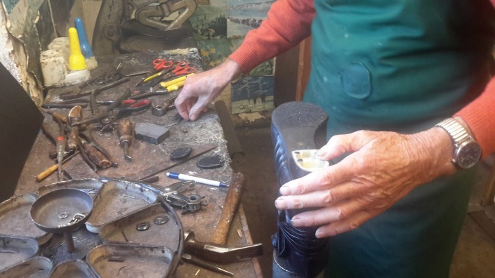 De bijbehorende foto’s geven een beeld van het interieur van de werkplaats waarin de schoenmaker in de loop der tijd een uniek behang heeft gecreëerd van foto’s uit tijdschriften en kalenders.